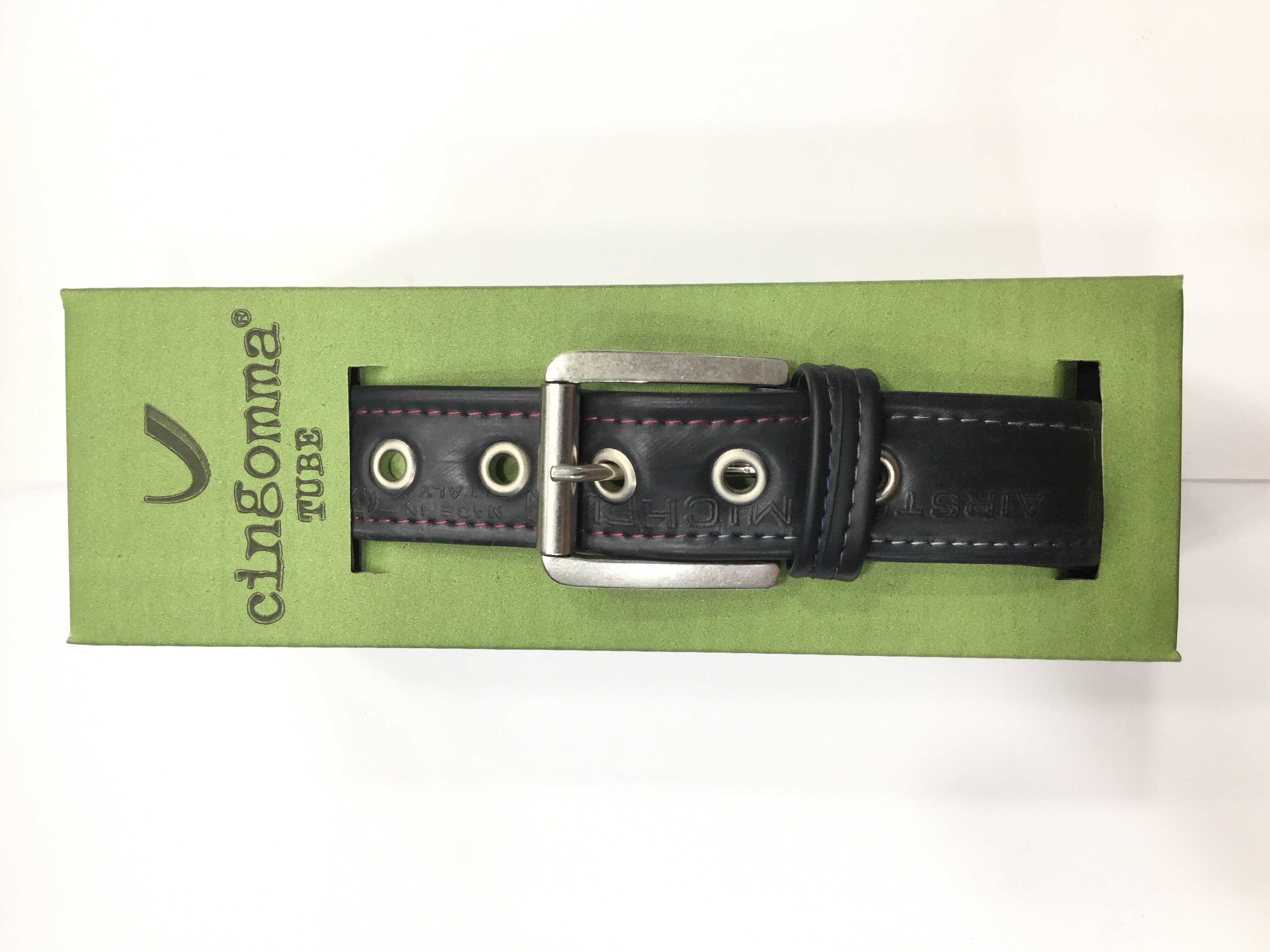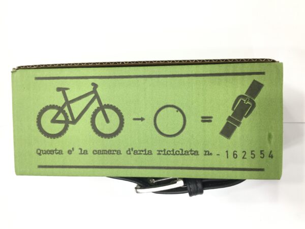 La cintura Cingomma Tube diversamente dalle sue sorelle, è realizzata con le camere d’aria usate di bicicletta, è morbida e liscia ed a volte ha delle toppe per le riparazioni delle forature.