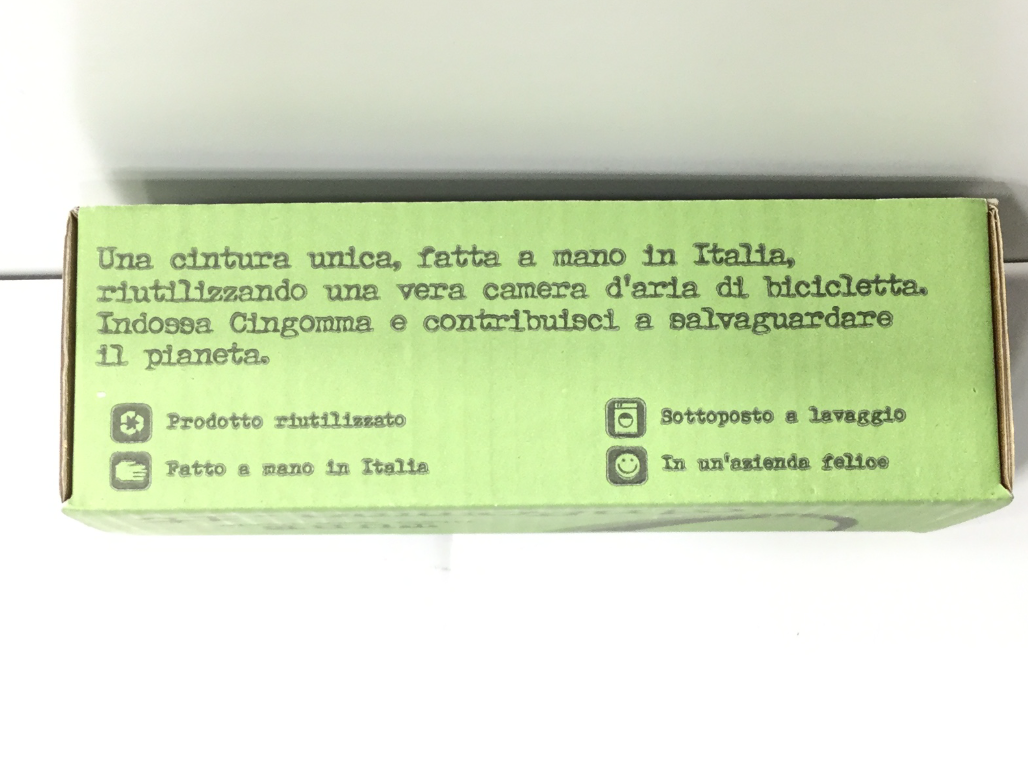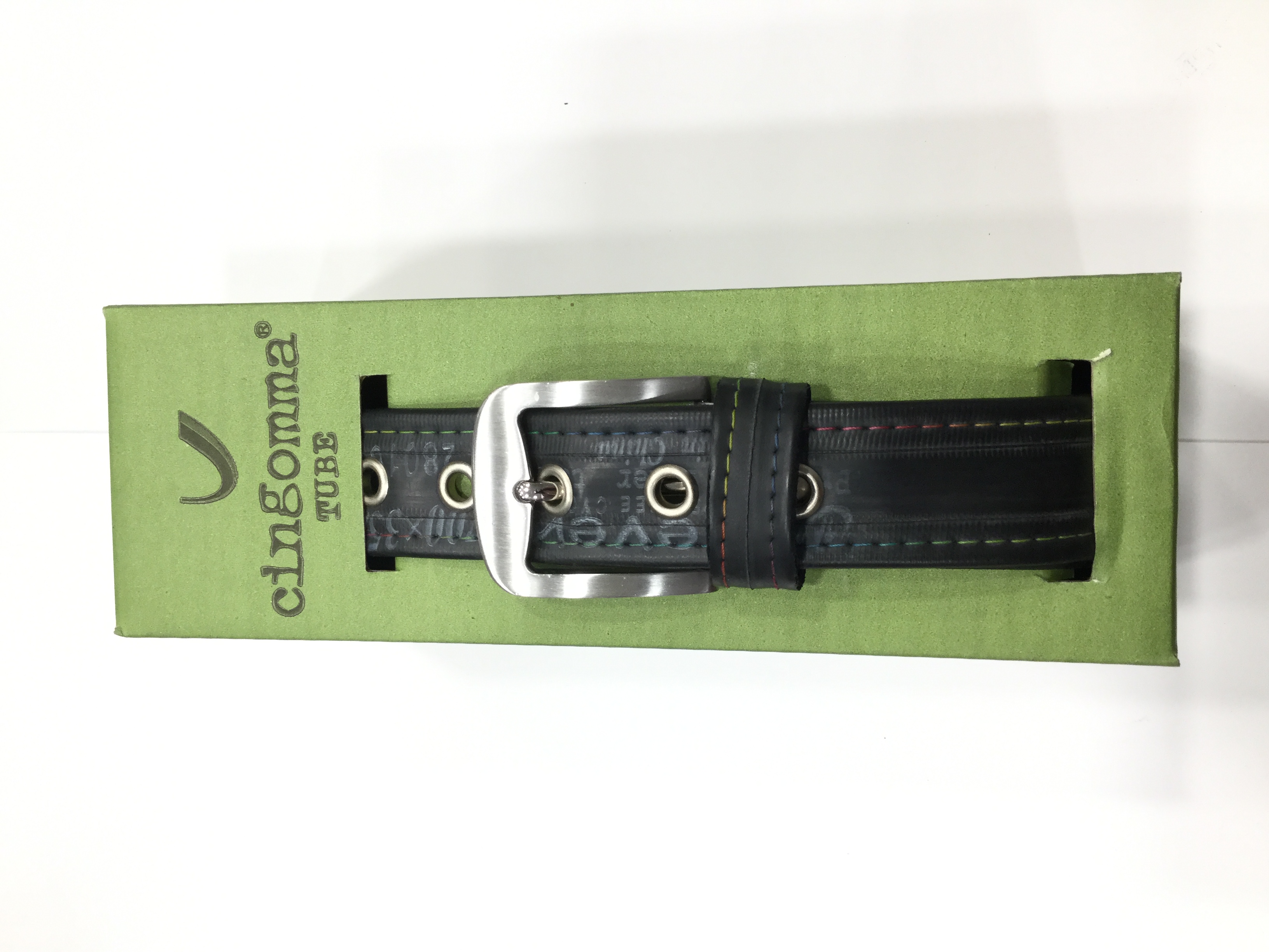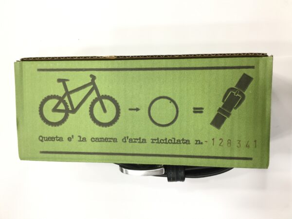 La cintura Cingomma Tube diversamente dalle sue sorelle, è realizzata con le camere d’aria usate di bicicletta, è morbida e liscia ed a volte ha delle toppe per le riparazioni delle forature.